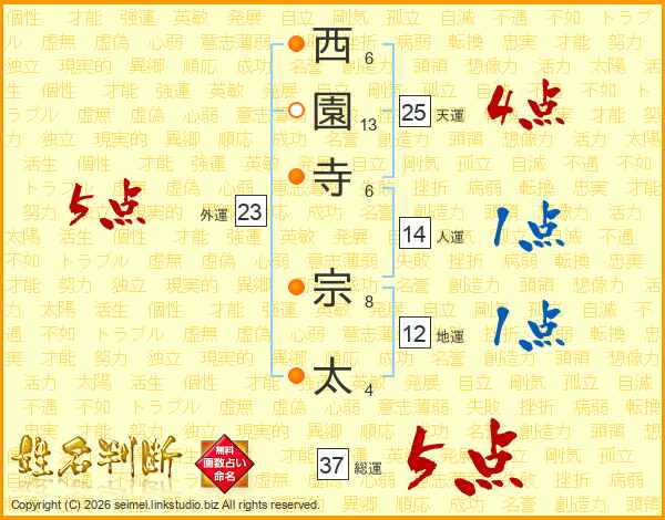 西(6画)園(13画)寺(6画) 宗(8画)太(4画)