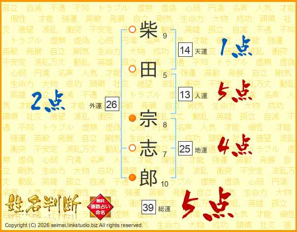 柴(9画)田(5画) 宗(8画)志(7画)郎(10画)