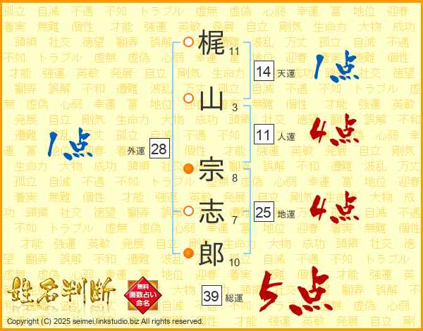 梶(11画)山(3画) 宗(8画)志(7画)郎(10画)