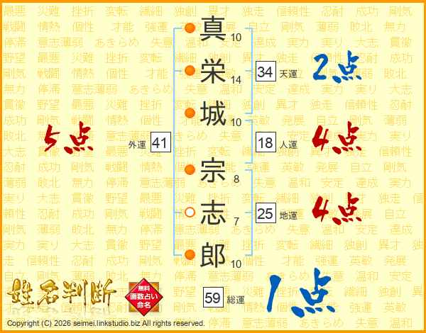 真(10画)栄(14画)城(10画) 宗(8画)志(7画)郎(10画)