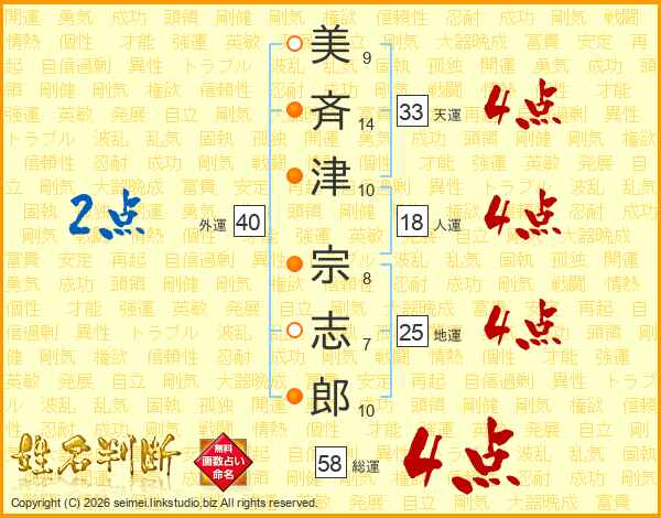 美(9画)斉(14画)津(10画) 宗(8画)志(7画)郎(10画)