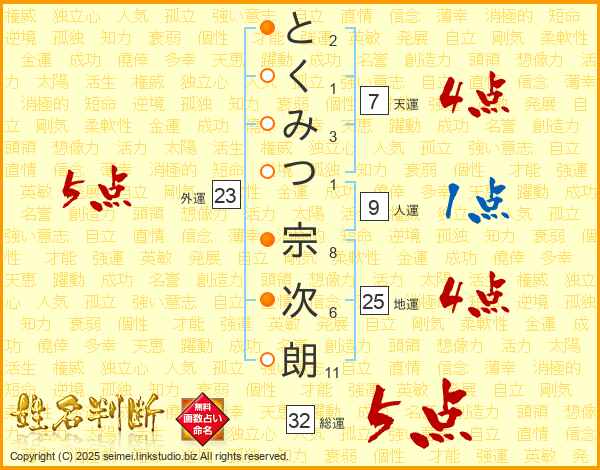 と(2画)く(1画)み(3画)つ(1画) 宗(8画)次(6画)朗(11画)
