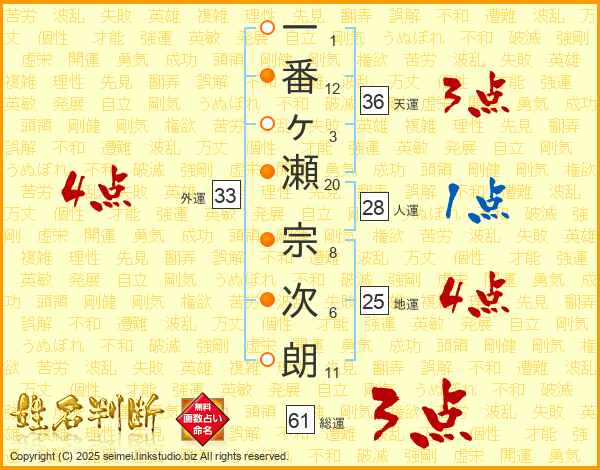 一番ヶ瀬宗次朗さんの外運は33画の4点!