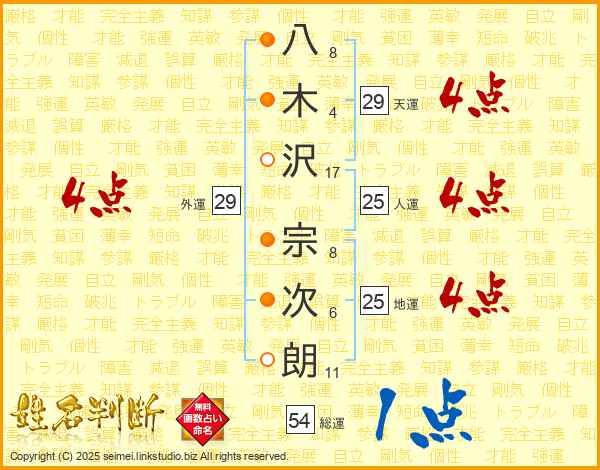 八(8画)木(4画)沢(17画) 宗(8画)次(6画)朗(11画)