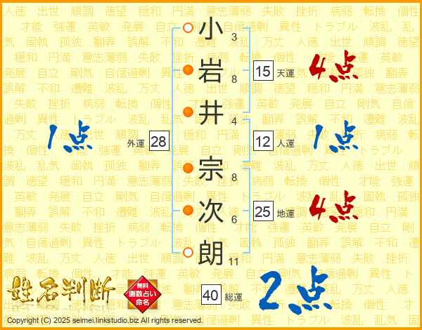 小(3画)岩(8画)井(4画) 宗(8画)次(6画)朗(11画)