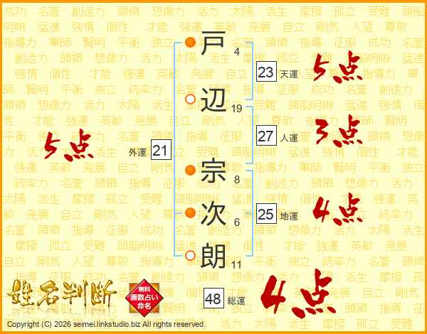 戸(4画)辺(19画) 宗(8画)次(6画)朗(11画)