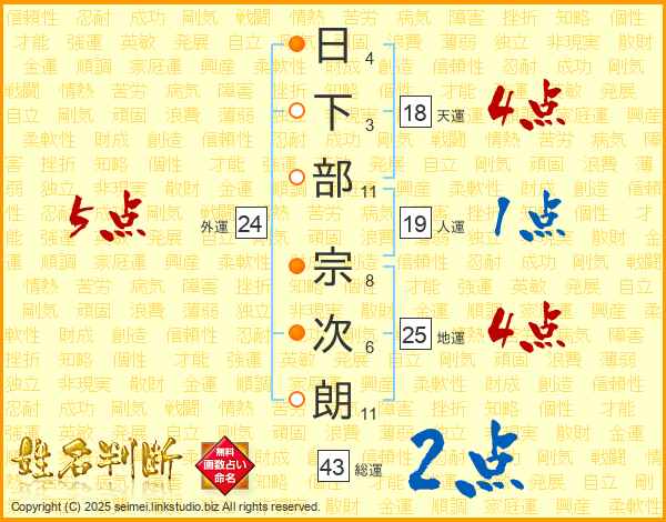 日下部宗次朗さんの総運は43画の2点!