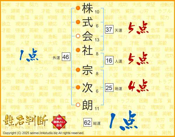 株(10画)式(6画)会(13画)社(8画) 宗(8画)次(6画)朗(11画)
