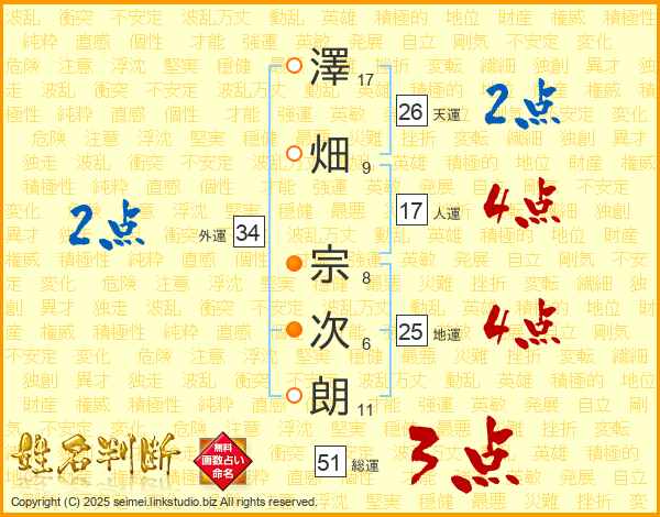 澤畑宗次朗さんの人運は17画の4点!