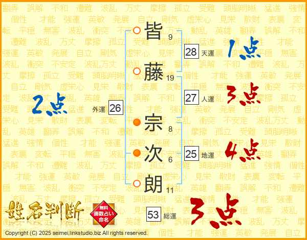 皆(9画)藤(19画) 宗(8画)次(6画)朗(11画)