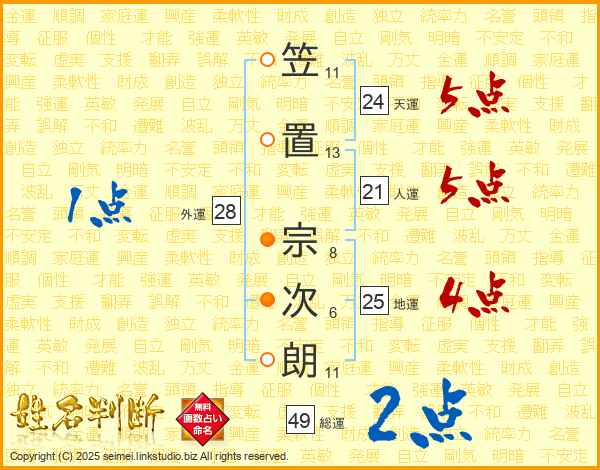 笠置宗次朗さんの総運は49画の2点!