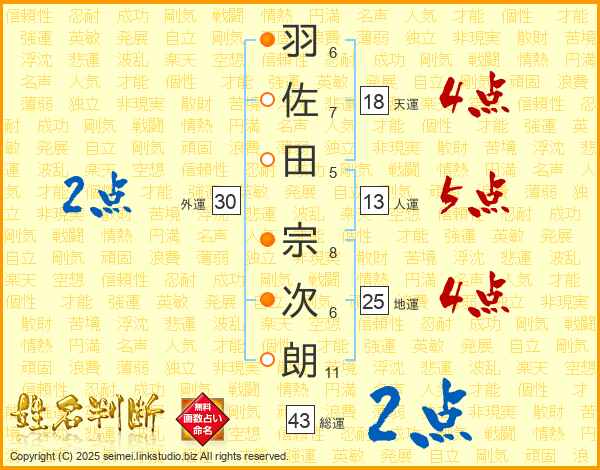 羽佐田宗次朗さんの総運は43画の2点!