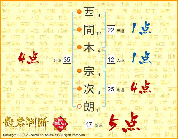 西(6画)間(12画)木(4画) 宗(8画)次(6画)朗(11画)