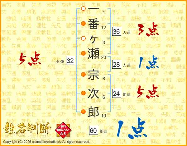 一番ヶ瀬宗次郎さんの外運は32画の5点!