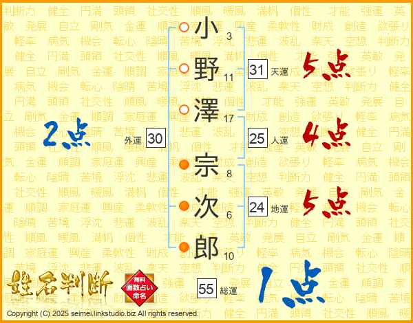 小(3画)野(11画)澤(17画) 宗(8画)次(6画)郎(10画)