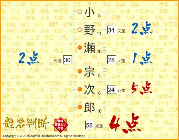 小(3画)野(11画)瀬(20画) 宗(8画)次(6画)郎(10画)