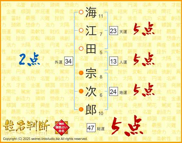 海(11画)江(7画)田(5画) 宗(8画)次(6画)郎(10画)