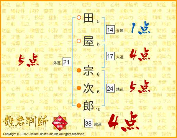 田(5画)屋(9画) 宗(8画)次(6画)郎(10画)