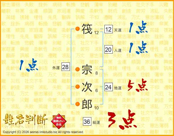 筏(12画) 宗(8画)次(6画)郎(10画)