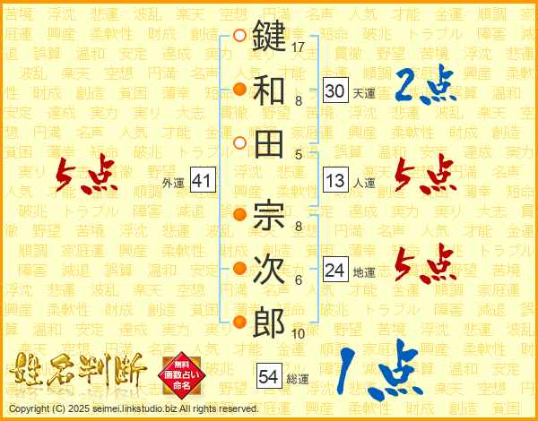鍵(17画)和(8画)田(5画) 宗(8画)次(6画)郎(10画)