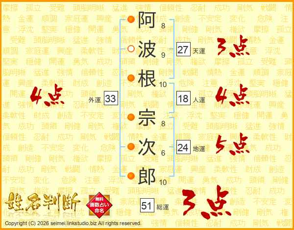 阿(8画)波(9画)根(10画) 宗(8画)次(6画)郎(10画)