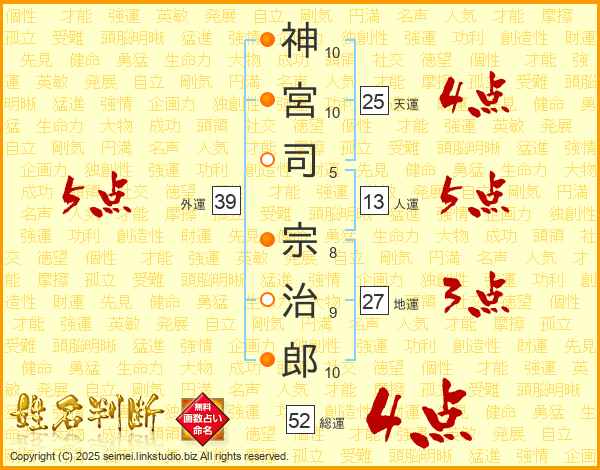 神(10画)宮(10画)司(5画) 宗(8画)治(9画)郎(10画)