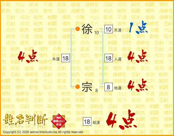 生活面を象徴する運勢です。外部から受ける影響力を表し、結婚運、家庭運や職場、環境への順応性を表します。総運から人運を引いた画数。姓や名が1文字の場合を除く。