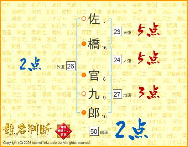 佐(7画)橋(16画) 官(8画)九(9画)郎(10画)
