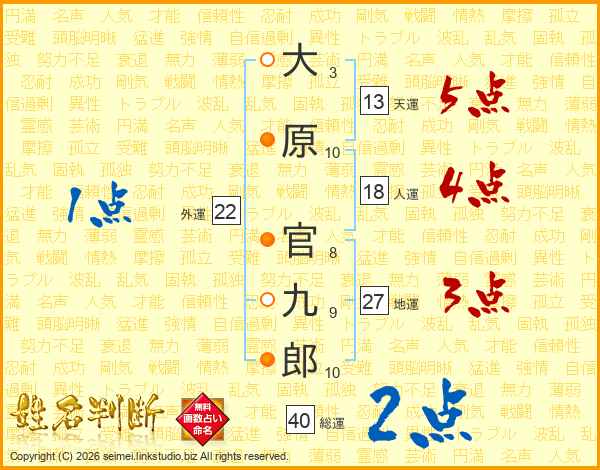 大(3画)原(10画) 官(8画)九(9画)郎(10画)