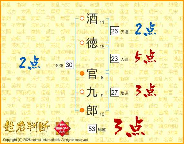 酒(11画)徳(15画) 官(8画)九(9画)郎(10画)