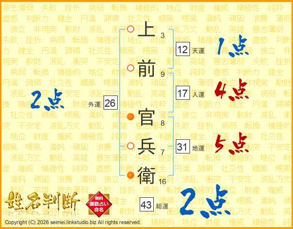 上(3画)前(9画) 官(8画)兵(7画)衛(16画)