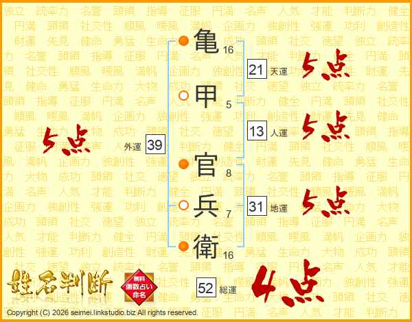 亀(16画)甲(5画) 官(8画)兵(7画)衛(16画)