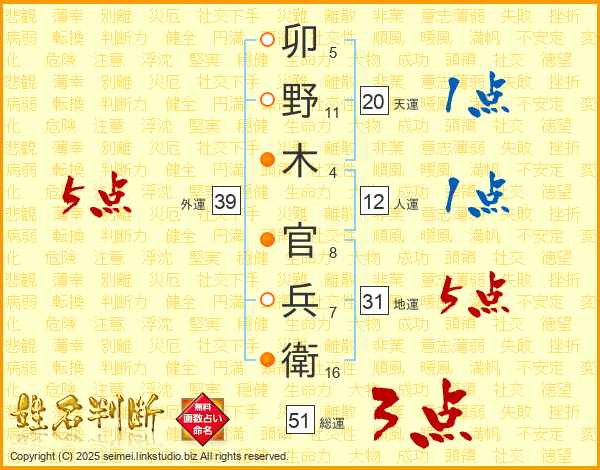 卯(5画)野(11画)木(4画) 官(8画)兵(7画)衛(16画)