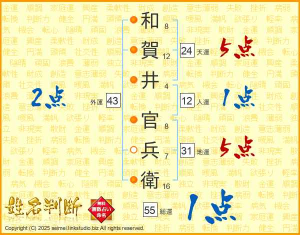 和(8画)賀(12画)井(4画) 官(8画)兵(7画)衛(16画)