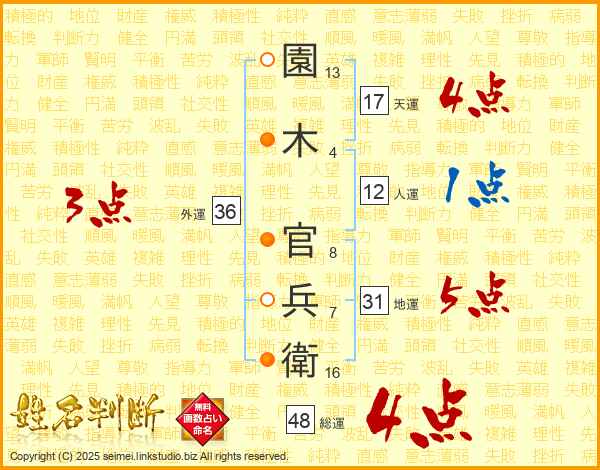 園(13画)木(4画) 官(8画)兵(7画)衛(16画)