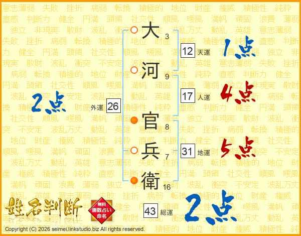 大河官兵衛さんの総運は43画の2点!