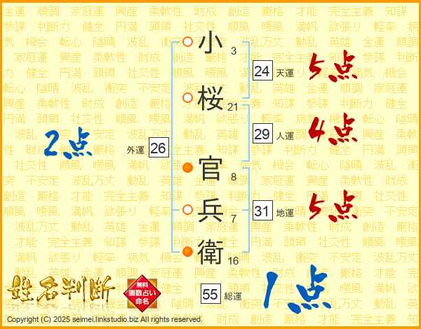小(3画)桜(21画) 官(8画)兵(7画)衛(16画)
