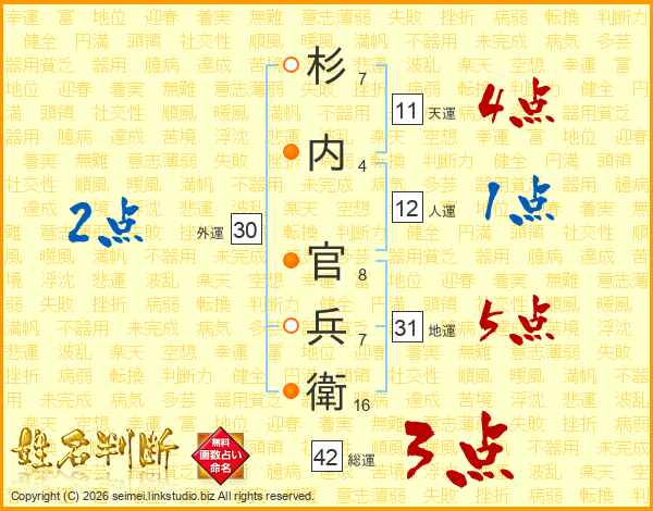 杉(7画)内(4画) 官(8画)兵(7画)衛(16画)