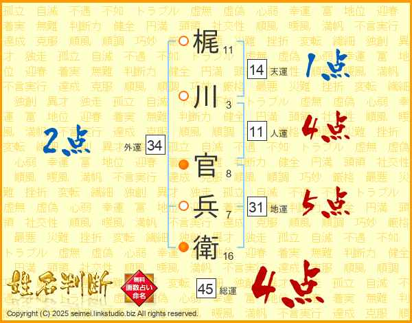 梶(11画)川(3画) 官(8画)兵(7画)衛(16画)