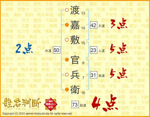 渡嘉敷官兵衛さんの総運は73画の4点!