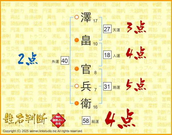 澤(17画)畠(10画) 官(8画)兵(7画)衛(16画)