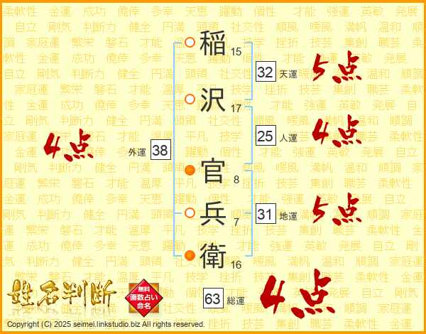 稲(15画)沢(17画) 官(8画)兵(7画)衛(16画)
