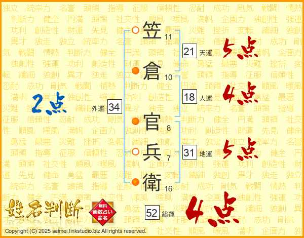 笠(11画)倉(10画) 官(8画)兵(7画)衛(16画)