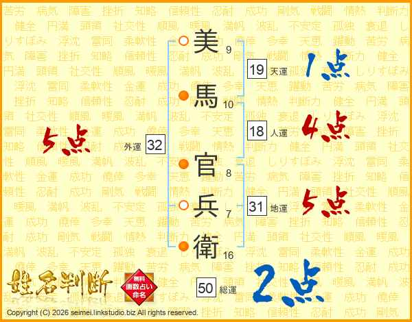 美(9画)馬(10画) 官(8画)兵(7画)衛(16画)