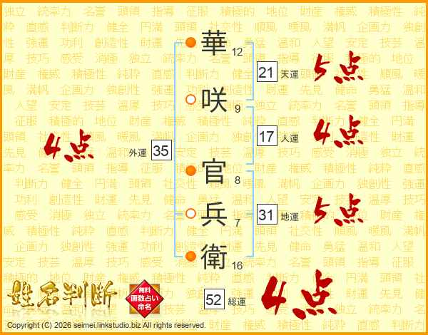 華(12画)咲(9画) 官(8画)兵(7画)衛(16画)