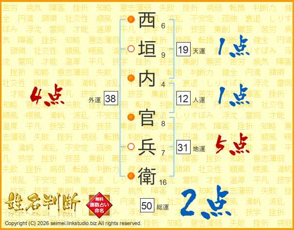 西(6画)垣(9画)内(4画) 官(8画)兵(7画)衛(16画)