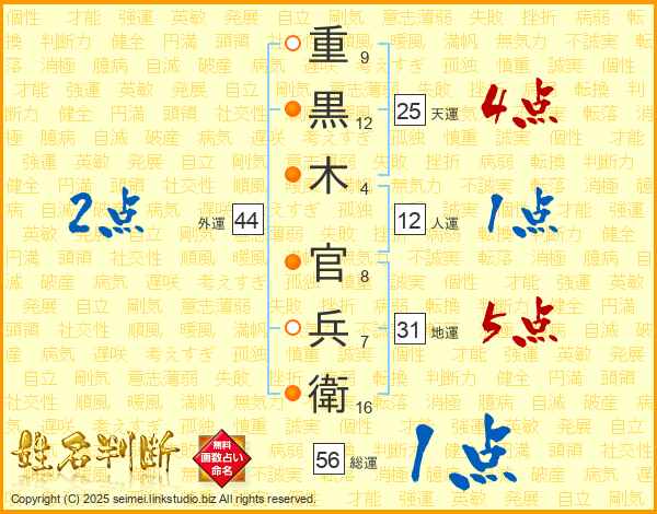 重(9画)黒(12画)木(4画) 官(8画)兵(7画)衛(16画)