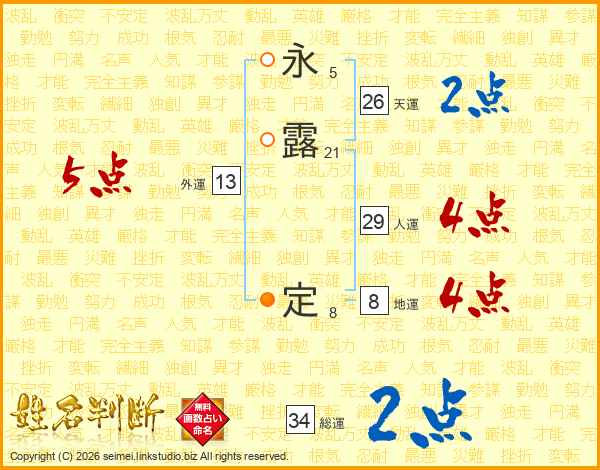 生活面を象徴する運勢です。外部から受ける影響力を表し、結婚運、家庭運や職場、環境への順応性を表します。総運から人運を引いた画数。姓や名が1文字の場合を除く。