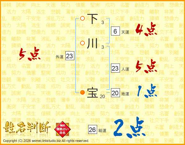 生活面を象徴する運勢です。外部から受ける影響力を表し、結婚運、家庭運や職場、環境への順応性を表します。総運から人運を引いた画数。姓や名が1文字の場合を除く。