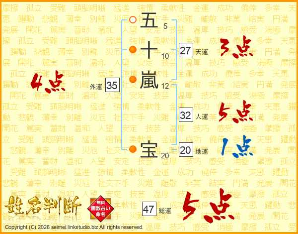 五(5画)十(10画)嵐(12画) 宝(20画)
